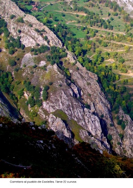 Carretera al pueblo de Casielles. Tiene 22 curvas